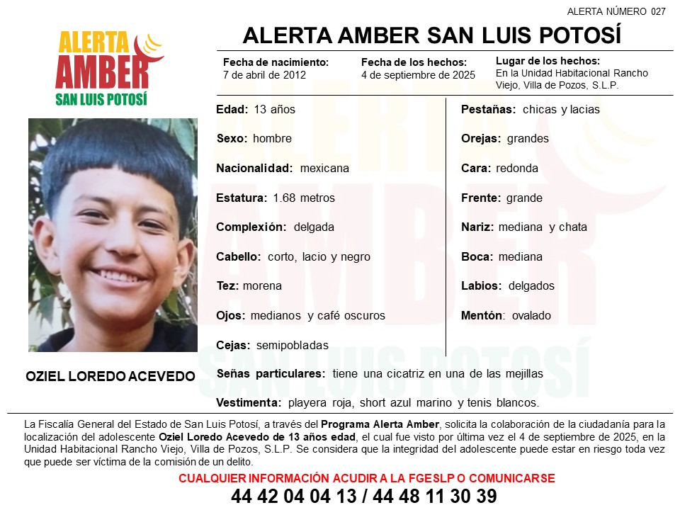 La Fiscalía General del Estado de San Luis Potosí (FGESLP) activó una ficha de Alerta Amber para la localización de Oziel Loredo Acevedo, quien tuvo contacto con sus familiares por última vez el 4 de septiembre de 2025, en la colonia Unidad Habitacional Rancho Viejo, Villa de Pozos.
