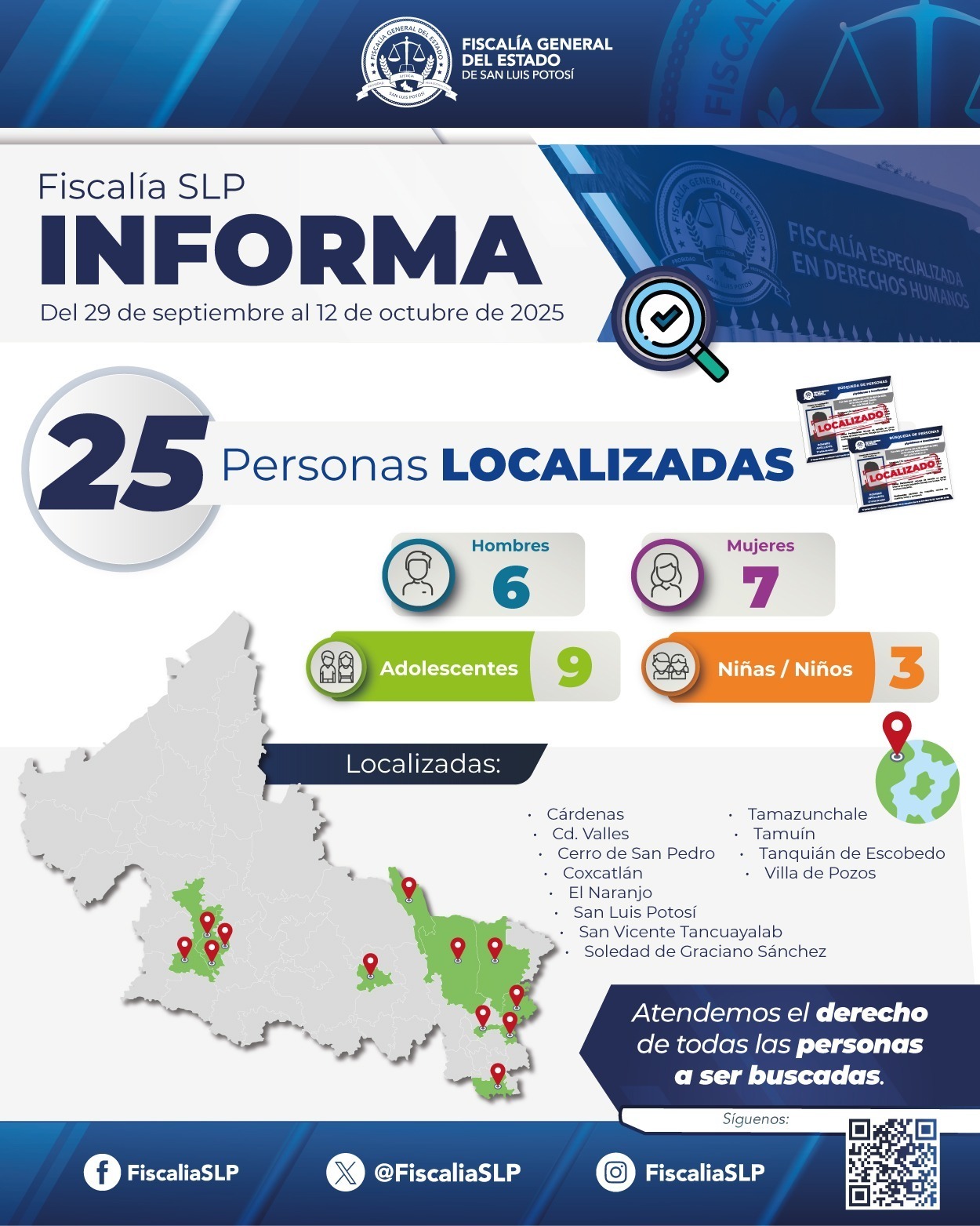 La Fiscalía General del Estado de San Luis Potosí (FGESLP) informa que, derivado de las investigaciones realizadas entre el 29 de septiembre y el 12 de octubre de 2025, se logró la localización de 25 personas que contaban con ficha de búsqueda activa en la entidad.