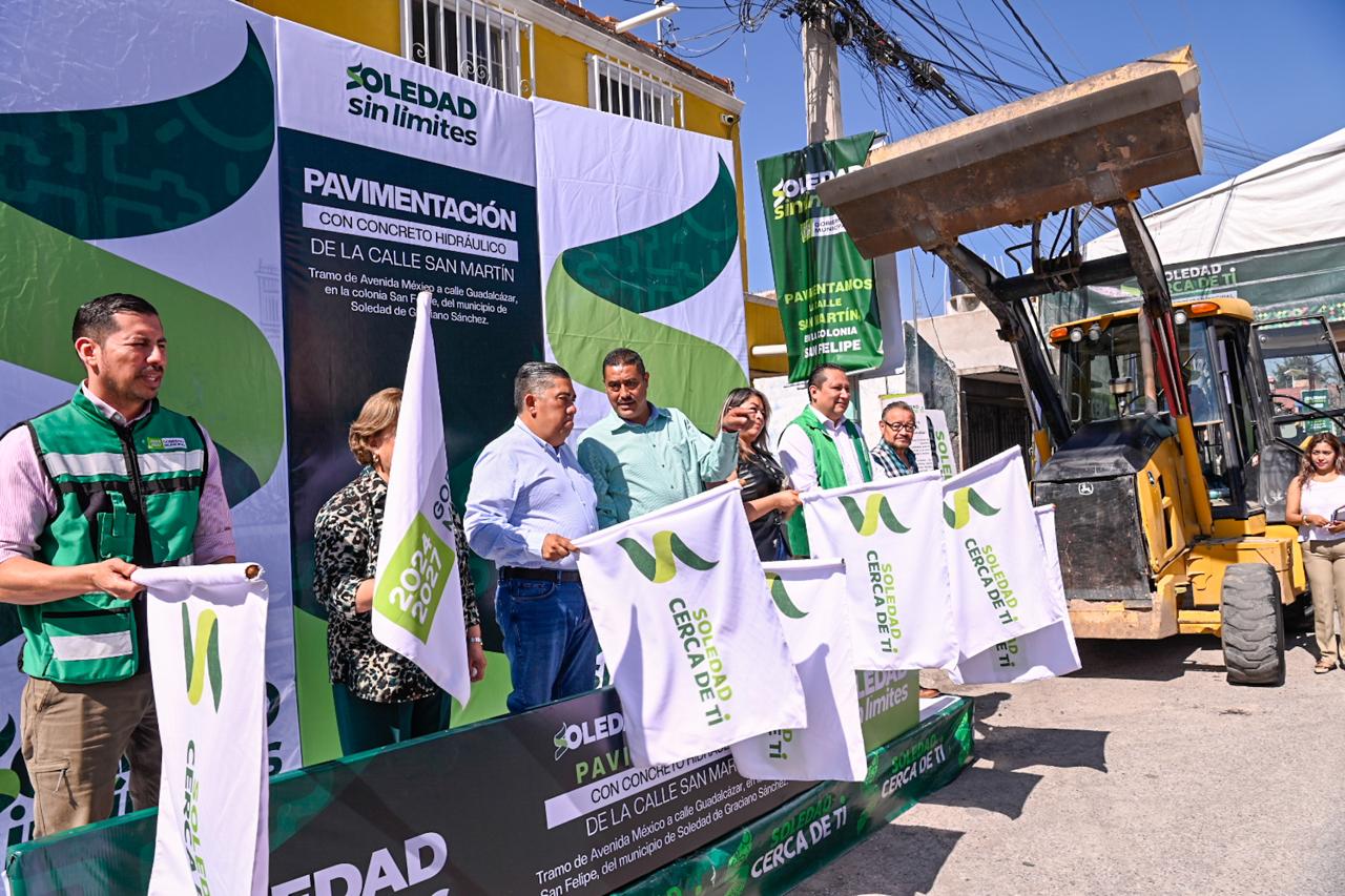 El Alcalde de Soledad de Graciano Sánchez, Juan Manuel Navarro Muñiz, dio este día el banderazo de arranque a la pavimentación con concreto hidráulico de la calle San Martín, en el tramo que comprende de avenida México a calle Guadalcázar, en la colonia San Felipe, con una inversión de más de 3 millones de pesos; este proyecto forma parte del plan integral de rehabilitación urbana que el Gobierno Municipal impulsa en esta colonia, donde previamente se concluyó la pavimentación de la calle Santa Catarina.