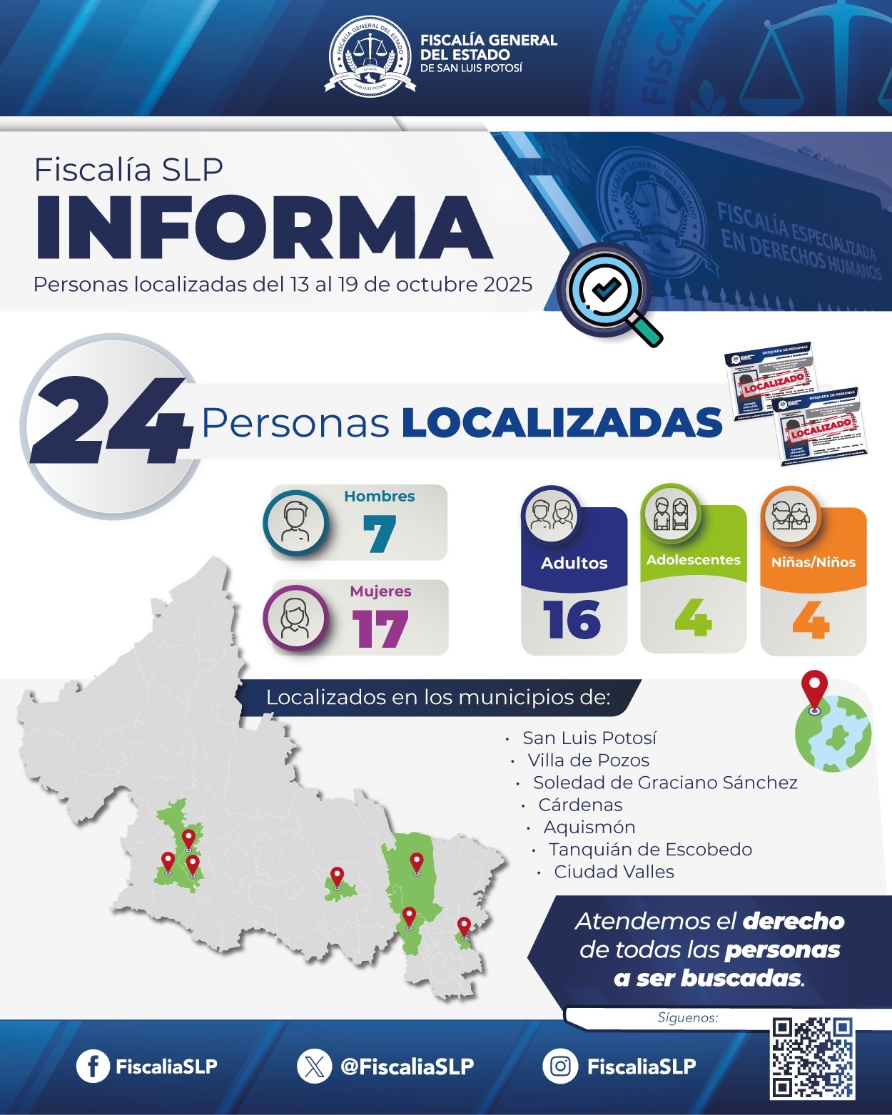Gracias a esta colaboración interinstitucional y al apoyo de la ciudadanía, las 17 mujeres y 7 hombres fueron ubicados en los municipios de Villa de Pozos, Soledad de Graciano Sánchez, Cárdenas, Aquismón, Tanquián de Escobedo, Ciudad Valles y la capital del estado. En entrevista, manifestaron que su ausencia se debió a motivos personales y que no fueron víctimas de la comisión de un delito.