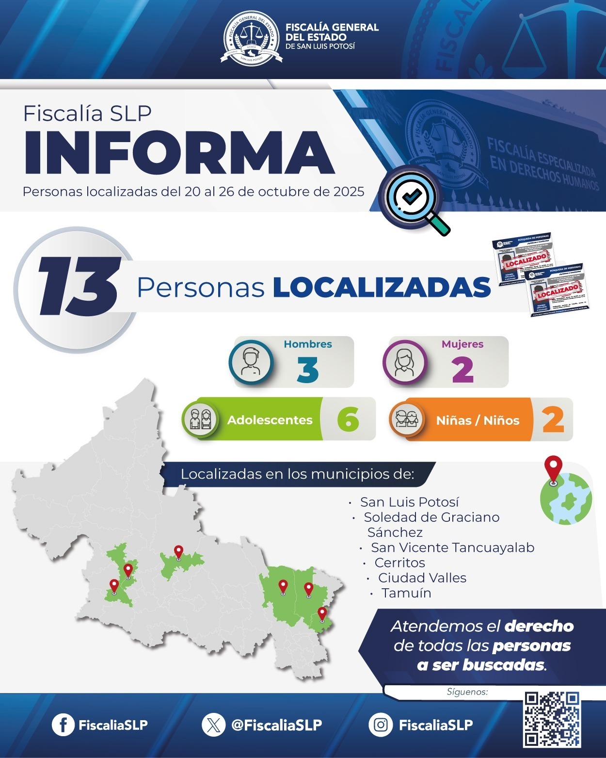 Durante los operativos que realiza la Fiscalía General del Estado de San Luis Potosí (FGESLP), posteriores a los reportes de personas no localizadas, se logró ubicar a 13 personas que tenían ficha de búsqueda activa en la entidad.