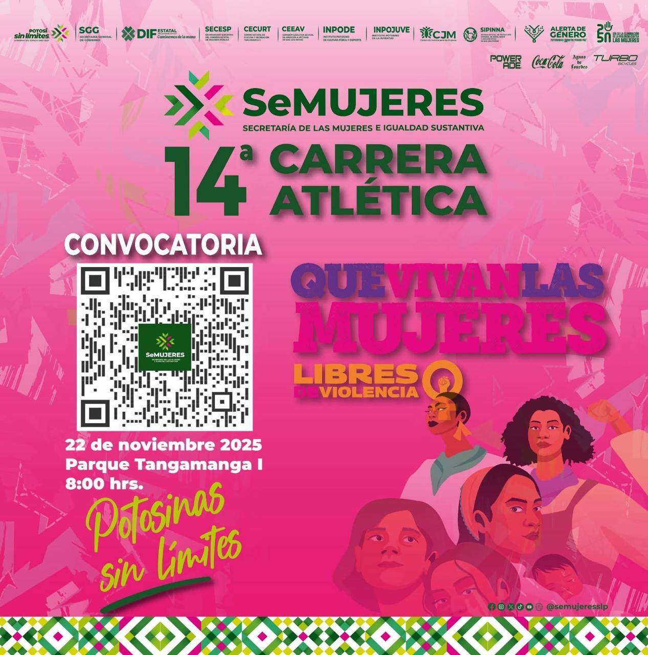 El sábado 22 de noviembre, en el parque Tangamanga I se realizará la XIV Carrera Atlética “Potosinas Sin Límites”, organizada por la Secretaría de las Mujeres por el #25N, mientras que el mismo día, en el Auditorio Renovación del parque Tangamanga II se celebrará la TOMODACHI CUP 2025, con competencias de kata y kumite, reuniendo a practicantes y familias de artes marciales.