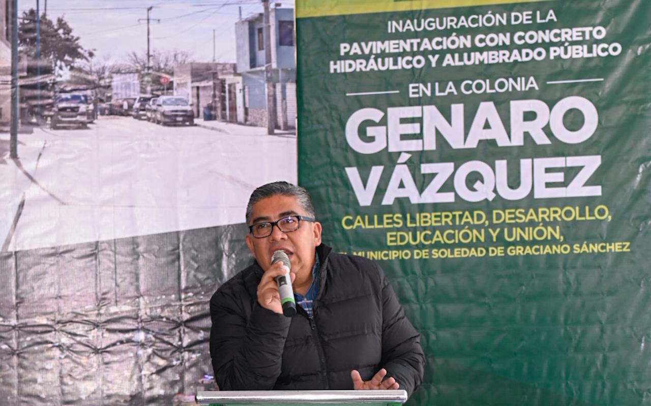 Juan Manuel Navarro Muñiz, Alcalde de Soledad de Graciano Sánchez, inauguró y entregó oficialmente, este martes, la pavimentación con concreto hidráulico y alumbrado público de las calles Revolución, Libertad, Desarrollo, Educación y Unión, en la colonia Genaro Vázquez, una obra histórica que marca un antes y un después para más de 4 mil 200 beneficiarios, con una inversión superior a los 19 millones de pesos, con lo que se logra transformar por completo la vida diaria de las familias que por años esperaron calles dignas, seguras y funcionales.